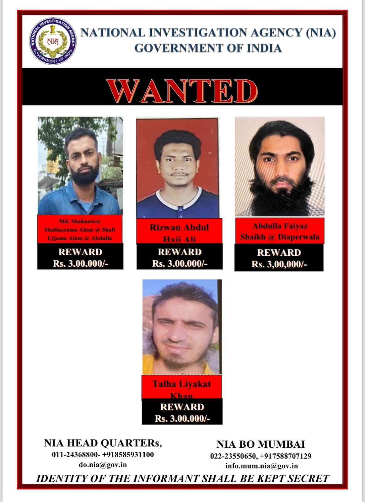 एनआईए ने 12 सितंबर को शाहनवाज, रिजवान अब्दुल हाजी अली, अब्दुल्ला फैयाज़ शेख़ और तल्हा लियाक़त खान पर तीन- तीन लाख रुपए का इनाम घोषित किया था।
