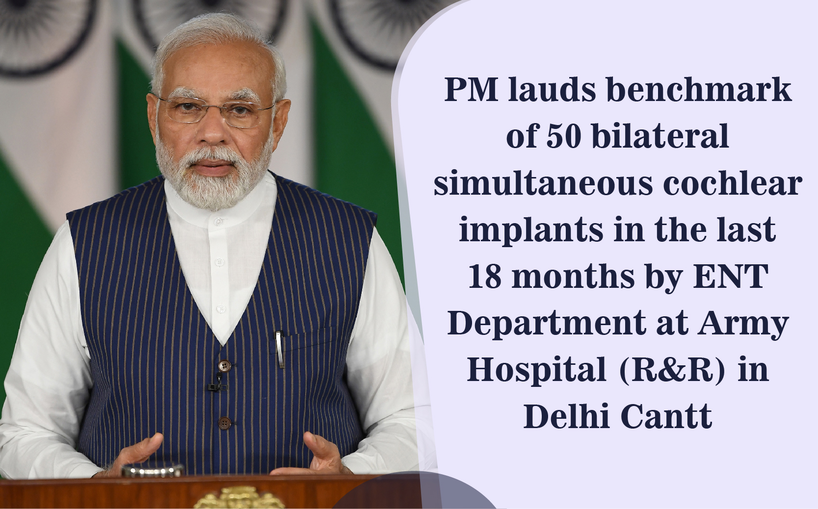 प्रधानमंत्री ने दिल्ली कैंट स्थित आर्मी हॉस्पिटल के ईएनटी विभाग द्वारा पिछले 18 महीनों में 50 मरीजों के दोनों कानों में एक साथ ध्वनि यंत्र प्रत्यारोपण के कीर्तिमान की, की सराहना