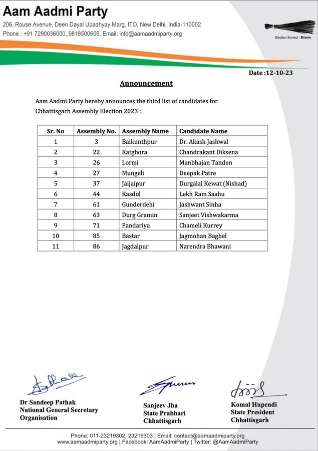 छत्तीसगढ़ चुनाव के लिए आम आदमी पार्टी ने जारी की तीसरी लिस्ट, 11 उमीदवारों के नामों का एलान