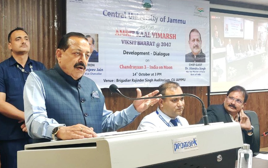 डॉ. जितेंद्र सिंह शनिवार को जम्मू केंद्रीय विश्वविद्यालय में ‘विकसित भारत @2047’ विषय के अंतर्गत चंद्रयान 3 पर ‘परिसर वार्तालाप (कैंपस डायलॉग)’ में उद्घाटन करते हुए अध्यक्षीय भाषण दे रहे थे।