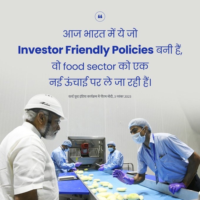 प्रधानमंत्री नरेन्द्र मोदी ने कहा कि वर्ल्ड फूड इंडिया के परिणाम भारत के खाद्य प्रसंस्करण क्षेत्र को ‘सूर्योदय क्षेत्र’ के रूप में पहचाने जाने का एक बड़ा उदाहरण हैं। प्रधानमंत्री ने कहा कि पिछले 9 वर्षों में सरकार की उद्योग समर्थक और किसान समर्थक नीतियों के परिणामस्वरूप इस क्षेत्र ने 50,000 करोड़ रुपये से अधिक का प्रत्यक्ष विदेशी निवेश आकर्षित किया है। प्रधानमंत्री ने खाद्य प्रसंस्करण क्षेत्र में पीएलआई योजना का उल्लेख करते हुए कहा कि यह उद्योग में नए उद्यमियों को बड़ी सहायता प्रदान कर रही है। उन्होंने उल्लेख किया कि फसल कटाई के बाद के बुनियादी ढांचे के लिए एग्री-इंफ्रा फंड के तहत हजारों परियोजनाओं पर कार्य चल रहा है, जिसमें लगभग 50,000 करोड़ रुपये से अधिक का निवेश है, जबकि मत्स्य पालन और पशुपालन क्षेत्र में प्रसंस्करण बुनियादी ढांचे को भी हजारों करोड़ रुपए के निवेश के साथ प्रोत्साहित किया जा रहा है।