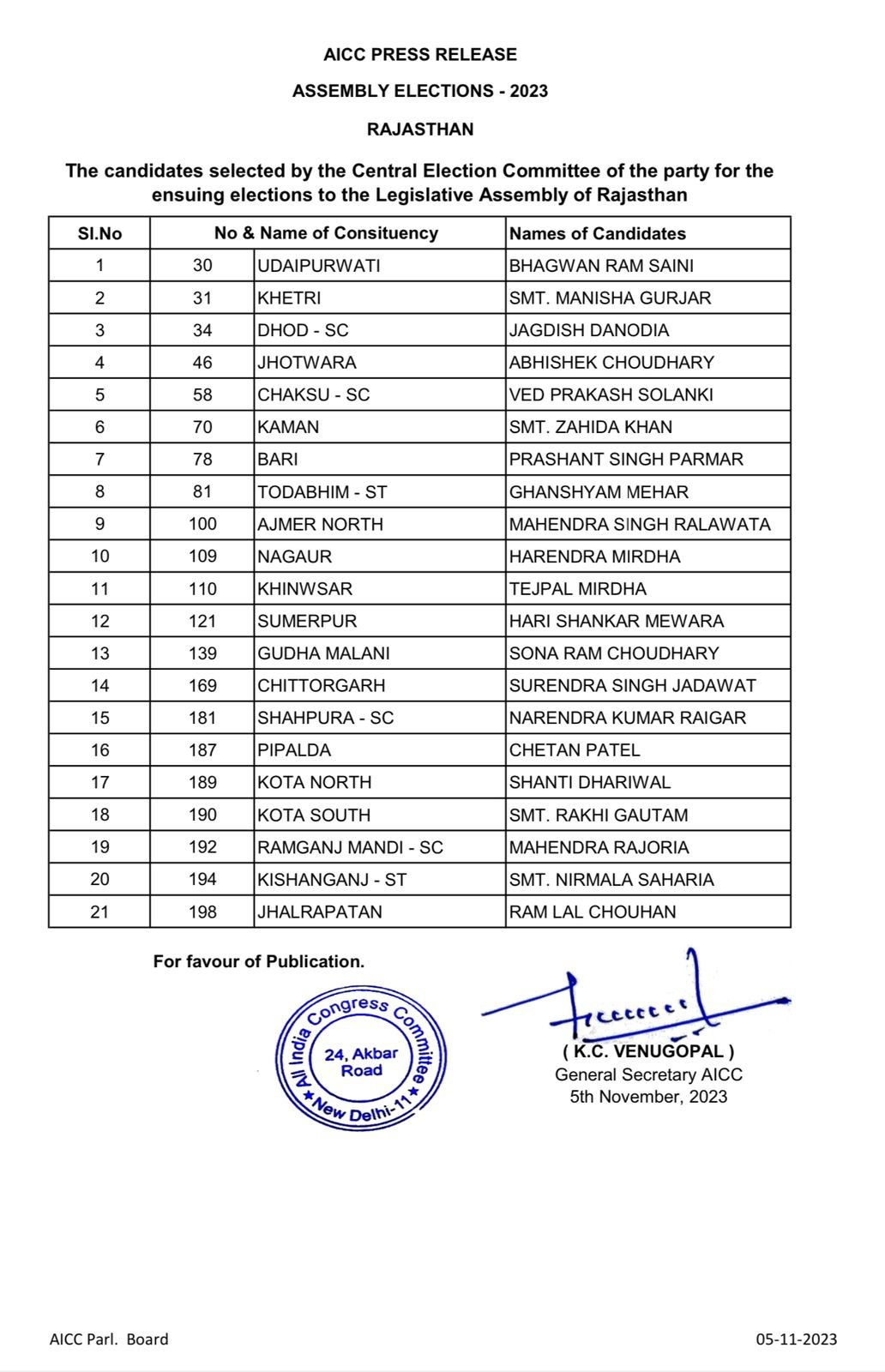 कांग्रेस ने 200 सदस्यीय विधानसभा के चुनाव के लिए कुल 199 उम्मीदवार घोषित किए हैं। कांग्रेस में भरतपुर विधानसभा सीट राष्ट्रीय लोकदल के लिए छोड़ दी है. राज्य की 200 सदस्यीय विधानसभा के लिए 25 नवंबर को मतदान होगा और मतगणना तीन दिसंबर को होगी.