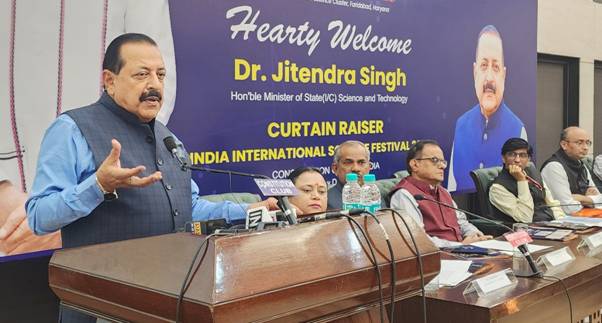 केंद्रीय विज्ञान एवं प्रौद्योगिकी राज्य मंत्री (स्वतंत्र प्रभार); पीएमओ, कार्मिक, लोक शिकायत एवं पेंशन, परमाणु ऊर्जा और अंतरिक्ष राज्य मंत्री डॉ. जितेंद्र सिंह जनवरी 2024 में फरीदाबाद में आयोजित होने वाले आगामी 9वें भारतीय अंतर्राष्ट्रीय विज्ञान महोत्सव (आईआईएसएफ) – 2023 के बारे में मीडिया को जानकारी दे रहे थे।