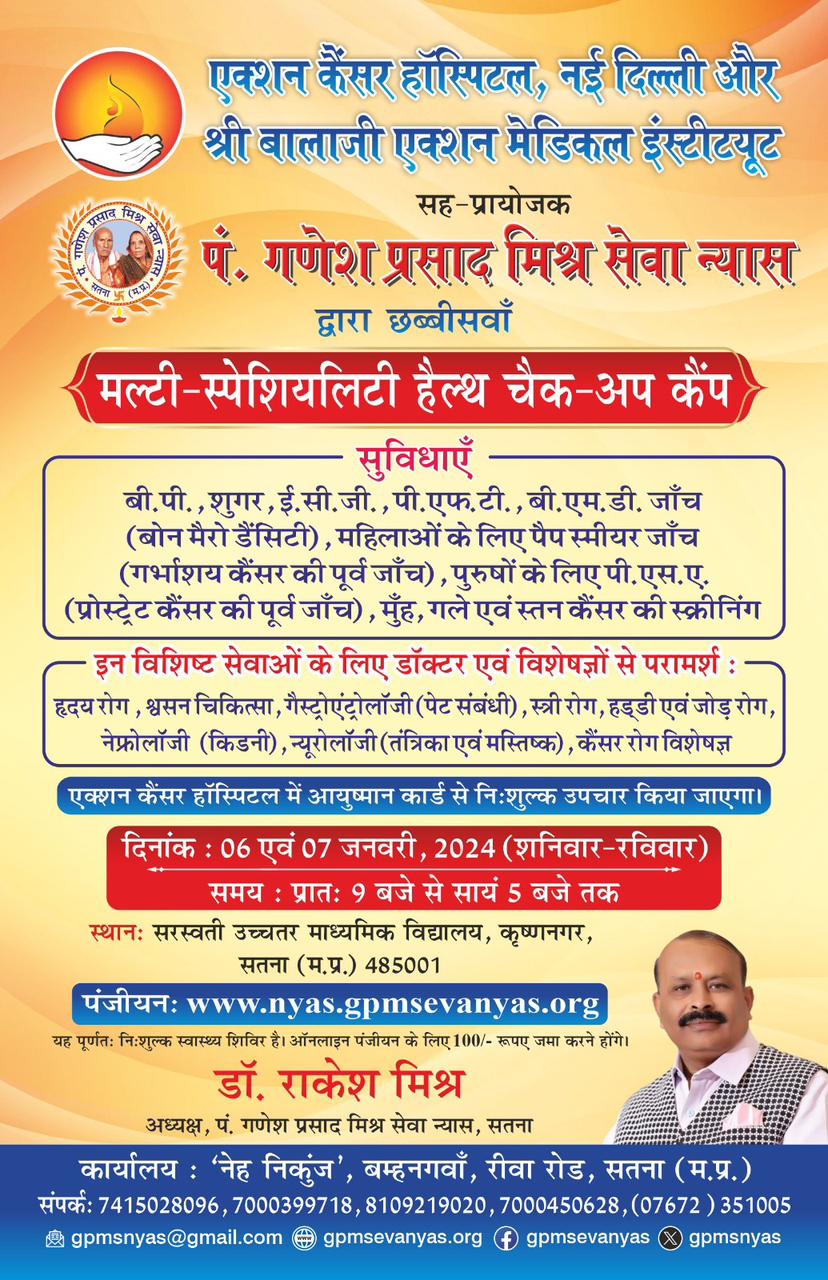 6 एवं 7 जनवरी 2024 को सतना में आयोजित होगा 26 वां मल्टी स्पेश्यिलिटी स्वास्थ्य शिविर