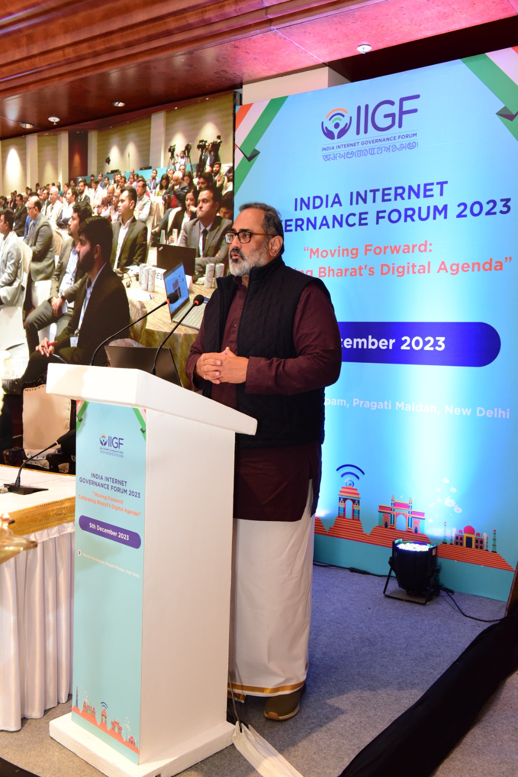 नई दिल्ली, 6दिसंबर।केंद्रीय इलेक्ट्रॉनिक्स एवं सूचना प्रौद्योगिकी (एमईआईटीवाई) और कौशल विकास एवं उद्यमिता राज्य मंत्री, राजीव चंद्रशेखर ने इंडिया इंटरनेट गवर्नेंस फोरम 2023 को संबोधित किया और अध्यक्षीय भाषण दिया। इंडिया इंटरनेट गवर्नेंस फोरम (आईआईजीएफ) का तीसरा संस्करण यहां नई दिल्ली में आयोजित किया गया था। इस वर्ष उक्त फोरम का विषय वैश्विक डिजिटल प्रशासन एवं सहयोग के नेतृत्व के लिए “आगे बढ़ना: भारत के डिजिटल एजेंडे को अंशांकित करना (मूविंग फॉरवर्ड : कैलिब्रेटिंग भारत्स डिजिटल एजेंडा) ” था और इसके उप-विषयों में भारत के लिए एक सुरक्षित, विश्वसनीय और लचीले साइबरस्पेस का निर्माण, भारत के विकासात्मक लक्ष्यों के लिए नवाचार को सक्षम करना, विभाजन को पाटना और भारत के डिजिटल एजेंडे को अंशांकित (कैलिब्रेट) करना शामिल था।