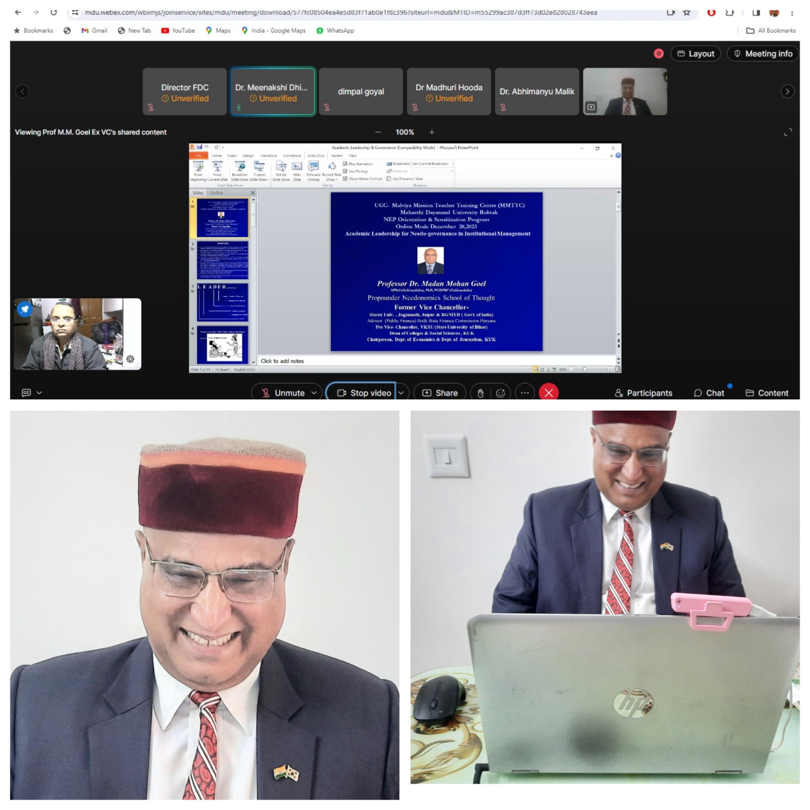 रोहतक,29 दिसम्बर।“नीडो-गवर्नेंस के प्रयासों के साथ मानवीय शिक्षण प्रदान करने के लिए शैक्षणिक नेतृत्व के बंदर दिमाग को भिक्षु दिमाग में बदलना होगा” I ये शब्द नीडोनोमिक्स स्कूल ऑफ थॉट के प्रवर्तक एवं पूर्व कुलपति, कुरूक्षेत्र विश्वविद्यालय के सेवानिवृत्त प्रोफेसर डॉ. मदन मोहन गोयल ने कहे । वह यूजीसी-मालवीय मिशन शिक्षक प्रशिक्षण केंद्र (एमएमटीटीसी) महर्षि दयानंद विश्वविद्यालय रोहतक द्वारा आयोजित एनईपी ओरिएंटेशन एंड सेंसिटाइजेशन प्रोग्राम (ऑनलाइन मोड) के प्रतिभागियों को संबोधित कर रहे थे। उनका विषय “संस्थागत प्रबंधन में नीडो-गवर्नेंस हेतु शैक्षणिक नेतृत्व” था । डॉ. माधुरी हुडा , प्रोजेक्ट कोऑर्डिनेटर तथा उपनिदेशिका,एमएमटीटीसी ने स्वागत भाषण दिया और प्रो एम.एम. गोयल की उपलब्धियों पर एक प्रशस्ति पत्र प्रस्तुत किया।