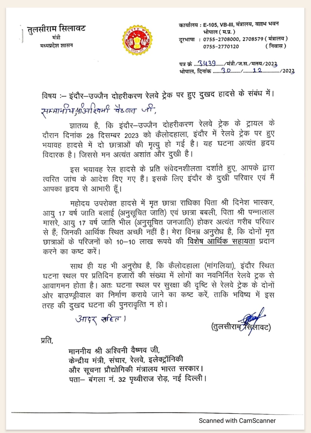कैबिनेट मंत्री सिलावट ने रेलवे हादसे में मृत बालिकाओं के परिवारजनों को 10 लाख की आर्थिक सहायता उपलब्ध कराने का किया अनुरोध