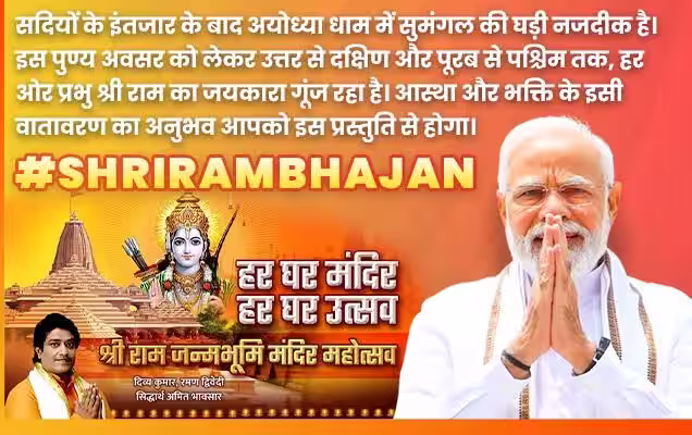 नई दिल्ली,13 जनवरी।प्रधानमंत्री नरेन्द्र मोदी ने दिव्य कुमार द्वारा गाया गया भक्तिपूर्ण भजन “हर घर मंदिर हर घर उत्सव” साझा किया है, जिसका संगीत सिद्धार्थ अमित भावसार ने दिया है। प्रधानमंत्री मोदी ने कहा कि सदियों के इंतजार के बाद, अयोध्या धाम में सुमंगल की घड़ी नजदीक है। प्रधानमंत्री मोदी ने आगे कहा, इस शुभ अवसर पर, उत्तर से दक्षिण और पूर्व से पश्चिम तक हर जगह भगवान राम की जयकार गूंज रही है।