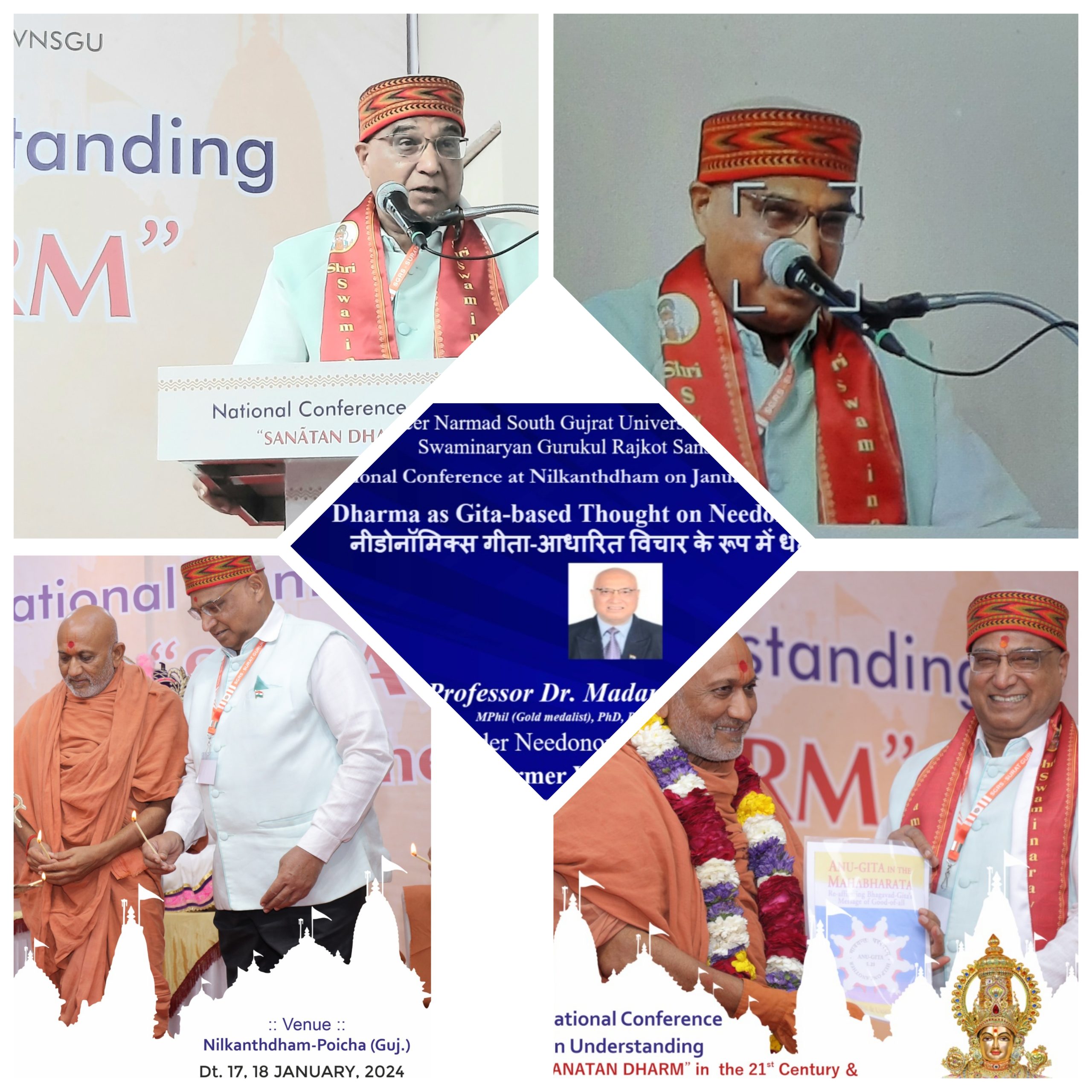 नीलकंठधाम (गुजरात), 17 जनवरी। “कृत्रिम बुद्धिमत्ता (एआई) से आगे रहने के लिए हमें धर्म पर आधारित विकसित भारत के प्रति सामूहिक प्रतिबद्धता के गुणक प्रभाव के लिए आध्यात्मिक रूप से निर्देशित भौतिकवाद (एसजीएम) रणनीति के साथ आध्यात्मिक बुद्धिमत्ता (एसआई) का उपयोग करना चाहिए।” ये शब्द पूर्व कुलपति एवं नीडोनोमिक्स स्कूल ऑफ थॉट के संस्थापक प्रो. मदन मोहन गोयल कुरुक्षेत्र विश्वविद्यालय से सेवानिवृत्त प्रोफेसर ने कहे । वह वीर नर्मद दक्षिण गुजरात विश्वविद्यालय, सूरत एवं स्वामीनारायण गुरुकुल राजकोट संस्थान द्वारा संयुक्त रूप से आयोजित राष्ट्रीय सम्मेलन के प्रतिभागियों को ” नीडोनॉमिक्स गीता-आधारित विचार के रूप में धर्म ” विषय पर संबोधित कर रहे थे।