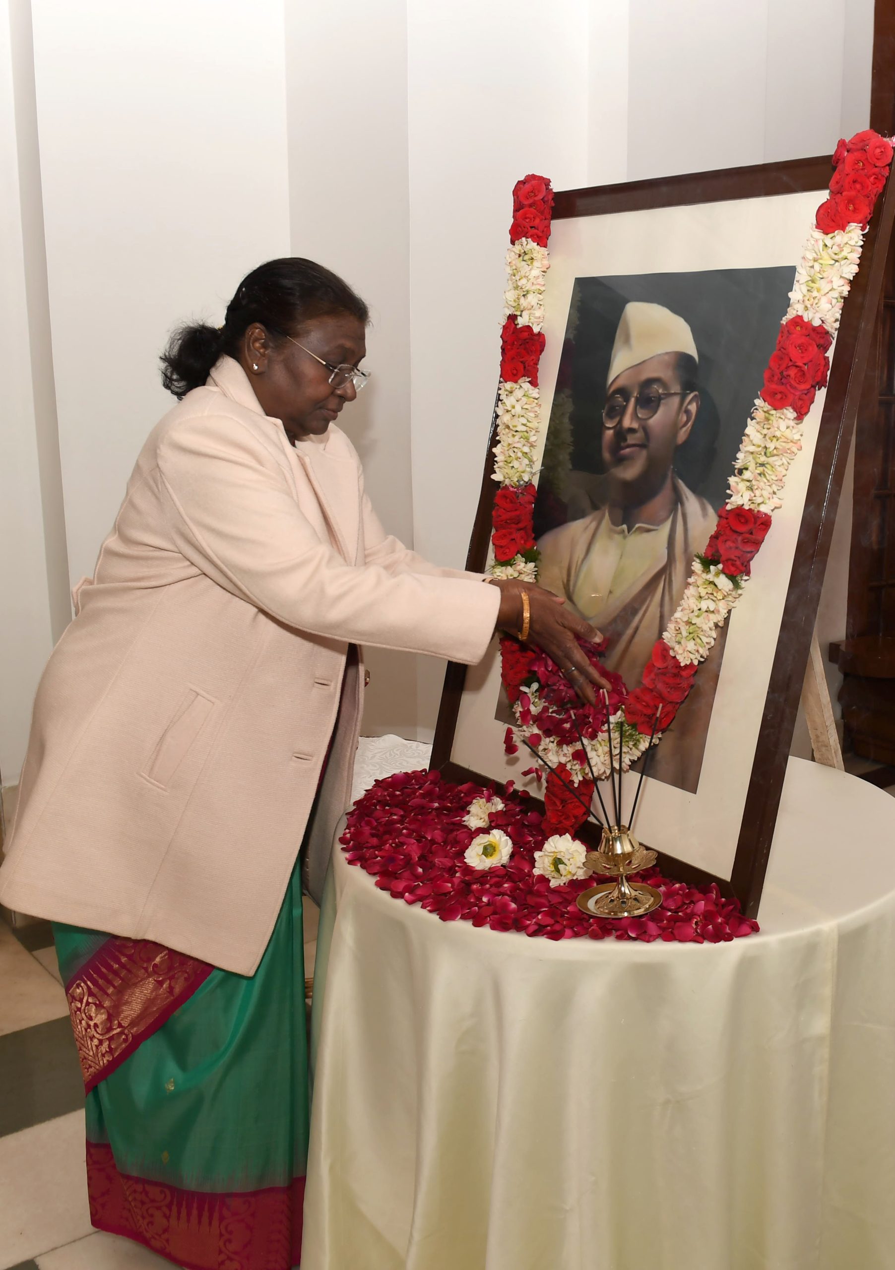 नई दिल्ली, 23जनवरी। राष्ट्रपति द्रौपदी मुर्मु ने आज को नेताजी सुभाष चंद्र बोस की जयंती पर उन्हें पुष्पांजलि अर्पित की। नेताजी की जयंती को पराक्रम दिवस के रूप में मनाया जाता है। उन्होंने राष्ट्रपति भवन में नेताजी के चित्र के सामने पुष्पांजलि अर्पित की।
