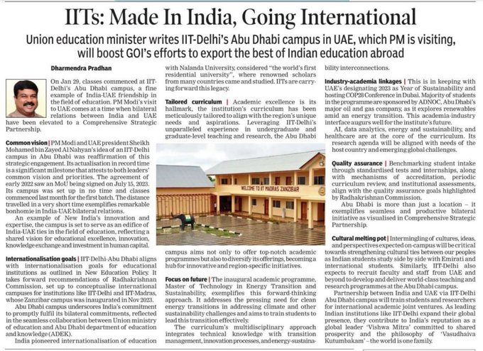 प्रधानमंत्री ने एक्स पर पोस्ट किया,”हमारी सरकार, नई शिक्षा नीति (एनईपी) के अंतर्गत हमारे शैक्षणिक संस्थानों के अंतर्राष्ट्रीय लक्ष्यों के लिए प्रतिबद्ध है। केंद्रीय शिक्षा मंत्री, श्री धर्मेंद्र प्रधान जी ने अपने लेख में इस भावना को साझा करते हुए लिखा है – आईआईटी-दिल्ली अबू धाबी परिसर और आईआईटी-मद्रास ज़ांज़ीबार परिसर, इस प्रतिबद्धता को दर्शाते हैं।”