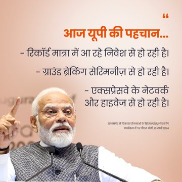 प्रधानमंत्री ने उत्तर प्रदेश मेंकी विकास गाथाके बारे में जानकारी दी और कहा कि उत्तर प्रदेशमें निवेश के रिकॉर्ड स्तर, ग्राउंड-ब्रेकिंग समारोहों और एक्सप्रेसवे नेटवर्क और राजमार्गों का विस्तार इसके विकास की कहानी कहता है। उन्होंने बताया कि राज्य में कानून एवं व्यवस्था में सुधार पर विशेष बल दिया गया है, इसका उदाहरण अयोध्या में ऐतिहासिक राम मंदिर का निर्माण का सम्पन्न होना है।