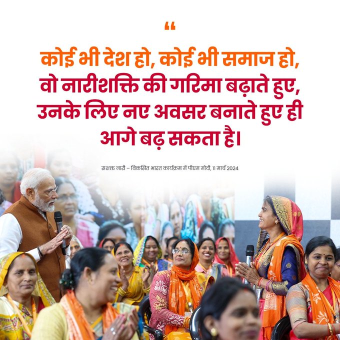प्रधानमंत्री ने कहा कि कोई भी समाज अवसर पैदा करके और नारी शक्ति की गरिमा सुनिश्चित करके ही प्रगति कर सकता है। उन्होंने कहा कि थोड़ी सी मदद से ही नारी शक्ति को आगे और मदद की जरूरत नहीं पड़ती है और वो दूसरों के लिए भी सहारा बन जाती है। प्रधानमंत्री ने कहा कि वह पहले प्रधानमंत्री हैं जिन्होंने लाल किले की प्राचीर से महिलाओं के लिए शौचालय, सैनिटरी पैड, अस्वास्थ्यकर धुएं वाली रसोई, महिलाओं को दैनिक असुविधा से बचाने के लिए नल का जल, हर व्यक्ति के लिए जन धन खाता, महिलाओं के लिए अपमानजनक भाषा के खिलाफ और बेटों को नारी शक्ति के प्रति उचित व्यवहार के बारे में शिक्षित करने की जरूरत जैसे महिला सशक्तिकरण के मुद्दों पर बात की।