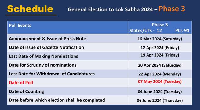 नई दिल्ली, 11अप्रैल। आम चुनाव 2024 के तीसरे चरण के लिए नामांकन कल से शुरू होगा। इस चरण में 12 राज्यों/केंद्र शासित प्रदेशों के 94 संसदीय निर्वाचन क्षेत्रों (पीसी) में चुनावों के लिए राजपत्र अधिसूचना कल यानी 12.04.2024 को जारी की जाएगी। मध्य प्रदेश के 29-बैतूल (एसटी) संसदीय क्षेत्र में स्थगित मतदान के लिए अलग से अधिसूचना भी कल जारी की जाएगी।