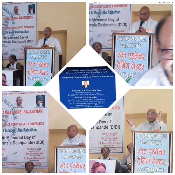 माउंट आबू, 01 मई। मतदाताओं को लुभाने हेतु गारंटी के राजनीतिक वादों को शिक्षाविदों द्वारा सही परिप्रेक्ष्य में समझना, विश्लेषण और व्याख्या करना होगा।” ये शब्द पूर्व कुलपति एवं नीडोनॉमिक्स स्कूल ऑफ थॉट के प्रवर्तक प्रोफेसर मदन मोहन गोयल जो कुरूक्षेत्र विश्वविद्यालय के अर्थशास्त्र विभाग से सेवानिवृत्त ने कहे। वे आज श्री वर्धमान महावीर केन्द्र माउंट आबू में आयोजित अखिल भारत रचनात्मक समाज (एबीआरएस), नई दिल्ली के सम्मेलन में बोल रहे थे।उनका विषय था ‘भारत में लोकतंत्र को मजबूत बनाना: शिक्षाविदों की भूमिका’।