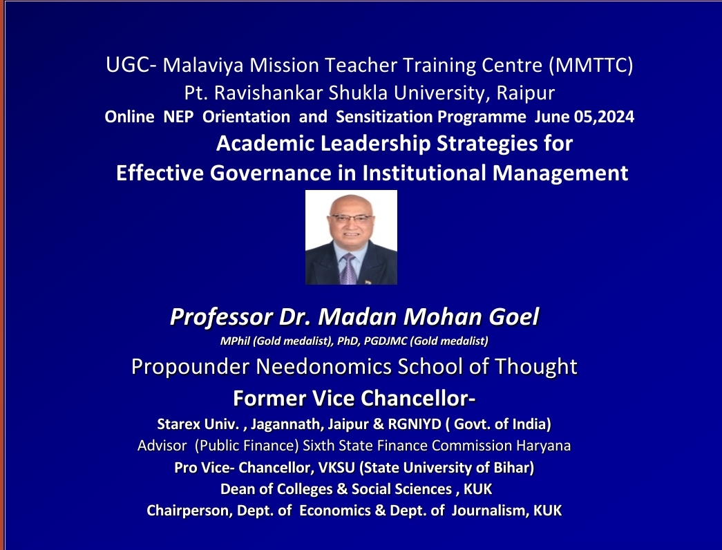 कुरूक्षेत्र, 5 जून। “शैक्षणिक नेतृत्व को जिम्मेदारी, जवाबदेही और नैतिकता के साथ काम करना चाहिए क्योंकि काम ही पूजा है और इसके विपरीत भी ”I ये शब्द तीन बार कुलपति, जिसमें राजीव गांधी राष्ट्रीय युवा विकास संस्थान (आरजीएनआईवाईडी श्रीपेरंबदूर) -राष्ट्रीय महत्व का संस्थान , एवं नीडोनोमिक्स स्कूल ऑफ थॉट के प्रवर्तक कुरूक्षेत्र विश्वविद्यालय से सेवानिवृत्त अर्थशास्त्र के प्रोफेसर डॉ. मदन मोहन गोयल ने कहे । वह यूजीसी-मालवीय मिशन शिक्षक प्रशिक्षण केंद्र (एमएमटीटीसी) पं. रविशंकर शुक्ल विश्वविद्यालय, रायपुर द्वारा आयोजित एनईपी ओरिएंटेशन एंड सेंसिटाइजेशन प्रोग्राम (ऑनलाइन मोड) के प्रतिभागियों को संबोधित कर रहे थे। उनका विषय ” संस्थागत प्रबंधन को सशक्त बनाना: प्रभावी शासन हेतु शैक्षणिक नेतृत्व रणनीतियाँ ” था । प्रो. प्रीति सुरेश निदेशक एमएमटीटीसी ने स्वागत भाषण दिया एवं प्रो एम.एम. गोयल की उपलब्धियों पर एक प्रशस्ति पत्र प्रस्तुत किया।