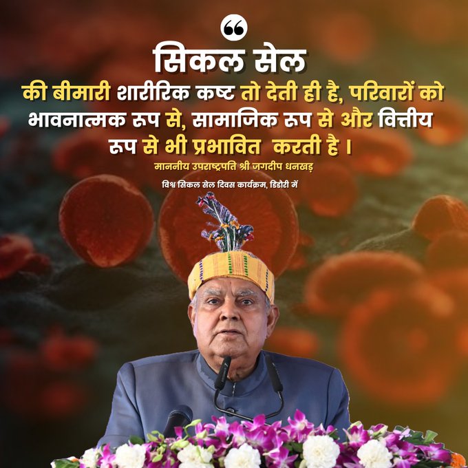 2047 तक भारत को सिकल सेल बीमारी से मुक्त करने के उद्देश्य से प्रारंभ किये गये राष्ट्रीय सिकल सेल एनीमिया उन्मूलन मिशन-2047 की प्रशंसा करते हुए श्री धनखड़ ने सभी से सक्रिय होकर इस मिशन को सफल बनाने के लिए कार्य करने का आह्वान किया। उनहोंने कहा कि “2047 का हवन शुरू हो चुका है और इस हवन में सभी को आहुति देनी है… भारत की प्रगति पर कोई अंकुश नहीं लगा पाएगा और पूर्ण आहुति तब होगी जब सिकल सेल का उन्मूलन 2046 में पूर्ण रूप से होगा।”