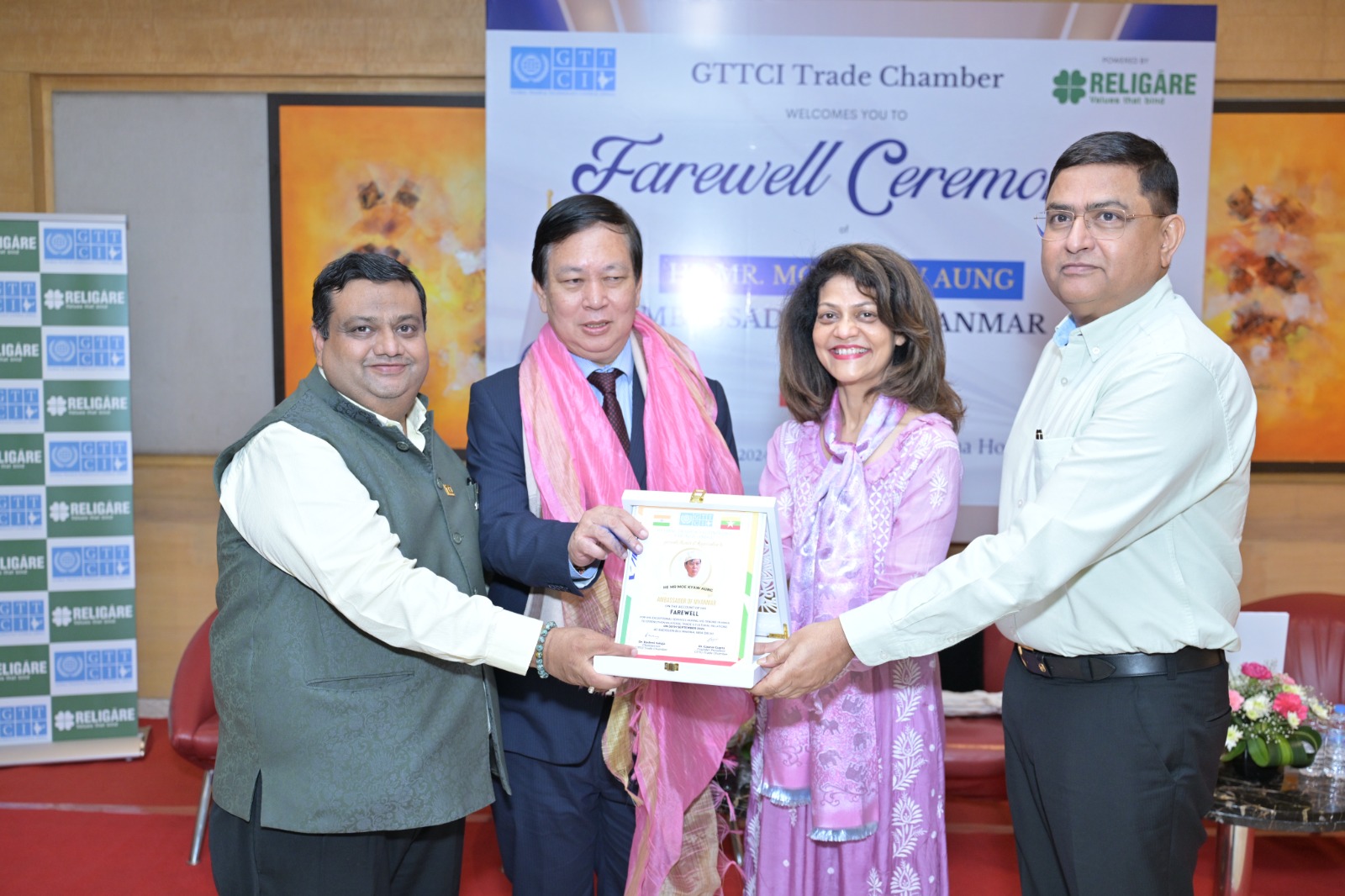 नई दिल्ली,3 अक्टूबर। 30 सितंबर 2024, रेडिसन ब्लू मरीना, नई दिल्ली ग्लोबल ट्रेड एंड टेक्नोलॉजी काउंसिल ऑफ इंडिया (जीटीटीसीआई) और रेलिगेयर समूह ने संयुक्त रूप से 30 सितंबर 2024 को रेडिसन ब्लू मरीना, नई दिल्ली में म्यांमार के राजदूत महामहिम श्री मो क्याव आंग के सम्मान में एक भावपूर्ण विदाई समारोह का आयोजन किया। इस कार्यक्रम में मंगोलिया के राजदूत महामहिम श्री गनबोल्ड डंबजाव, उज्बेकिस्तान के राजदूत महामहिम श्री सरदोर रुस्तमबेव और अंगोला, भूटान, ब्रुनेई और म्यांमार के दूतावासों के राजनयिकों सहित एक प्रतिष्ठित सभा ने भाग लिया।