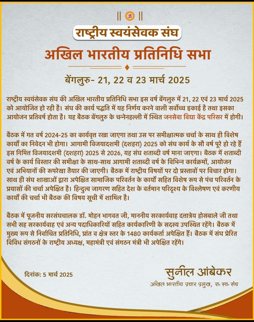 नई दिल्ली,7 मार्च। राष्ट्रीय स्वयंसेवक संघ (आरएसएस) की अखिल भारतीय प्रतिनिधि सभा इस वर्ष 21, 22 एवं 23 मार्च 2025 को बेंगलुरु के चन्नेनहल्ली स्थित जनसेवा विद्या केंद्र परिसर में आयोजित होगी। यह सभा संघ के वार्षिक कार्यक्रमों में से एक महत्वपूर्ण आयोजन होता है, जिसमें संगठन के वरिष्ठ पदाधिकारी, प्रांतों के प्रतिनिधि एवं प्रमुख कार्यकर्ता भाग लेते हैं।
