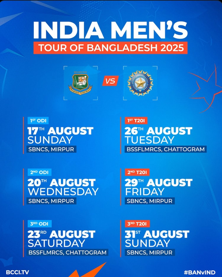 टीम इंडिया अगस्त में करेगी बांग्लादेश का दौरा: बीसीसीआई ने जारी किया पूरा शेड्यूल, कूटनीतिक चर्चाएं भी तेज़