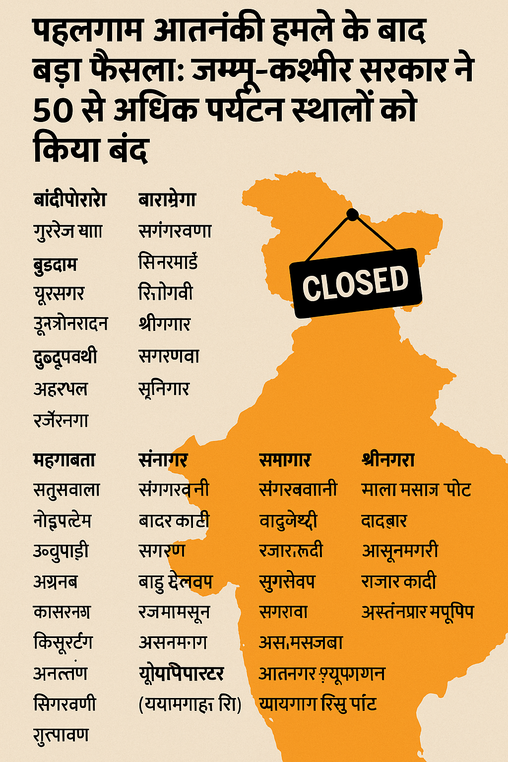 श्रीनगर 29 अप्रैल 2025: पहुगलाम में हाल ही में हुए आतंकी हमले के बाद जम्मू-कश्मीर सरकार ने राज्य के विभिन्न जिलों में फैले लगभग 50 प्रमुख पर्यटन स्थलों और ट्रैकिंग रूट्स को सुरक्षा कारणों से बंद करने का निर्णय लिया है। यह फैसला घाटी में पर्यटकों की सुरक्षा सुनिश्चित करने और संभावित आतंकी खतरे को देखते हुए लिया गया है।