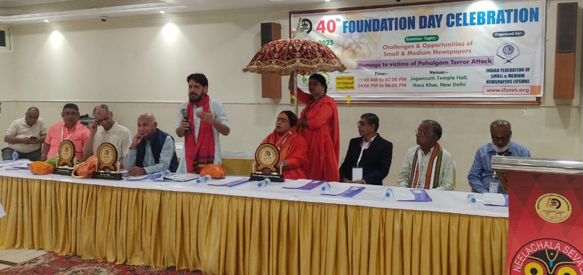 दिल्ली 1 मई 2025 : भारतीय लघु और मध्यम समाचार पत्र महासंघ (IFSMN) ने आज अपनी 40वीं स्थापना दिवस मनाया जिसमें मीडिया के सामने बढ़ती चुनौतियों पर प्रकाश डाला गया, विशेष रूप से पत्रकारिता के गिरते मानकों और छोटे तथा मध्यम आकार के समाचार पत्रों की समस्याओं पर। यह कार्यक्रम हौज़ खास स्थित जगन्नाथ मंदिर मीटिंग हॉल में आयोजित किया गया, जिसमें देशभर से पत्रकारों ने भाग लिया और वर्तमान स्थिति तथा भविष्य की दिशा पर चर्चा की।