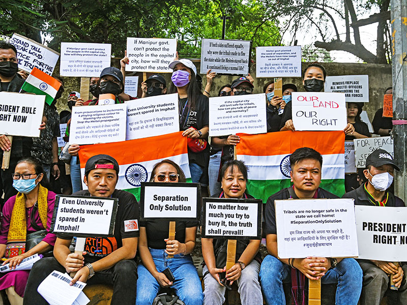 Members of the Kuki tribe hold Indian Flags and Placards in a protest against the killings of tribals in the North Eastern state of Manipur, in New Delhi, India on May 31, 2023. Kukis and Meiteis groups of the India's north eastern state of Manipur have been on clashes since May 3 over demands of economic benefits and reservation status. (Photo by Kabir Jhangiani/NurPhoto via Getty Images)