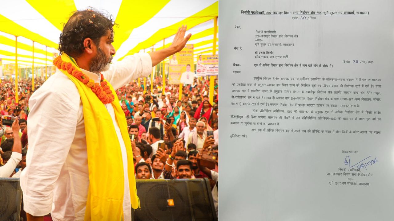 पटना, 28 अक्टूबर: जन सुराज पार्टी के प्रमुख और जाने-माने चुनावी रणनीतिकार प्रशांत किशोर पर चुनाव आयोग ने गंभीर कार्रवाई की है। आरोप है कि उन्होंने दो अलग-अलग राज्यों—बिहार और पश्चिम बंगाल—की मतदाता सूचियों में अपना नाम दर्ज कराया है। इस मामले में इलेक्टोरल रजिस्ट्रेशन ऑफिसर (ERO) ने उन्हें नोटिस जारी करते हुए तीन दिनों के भीतर स्पष्टीकरण देने का निर्देश दिया है।