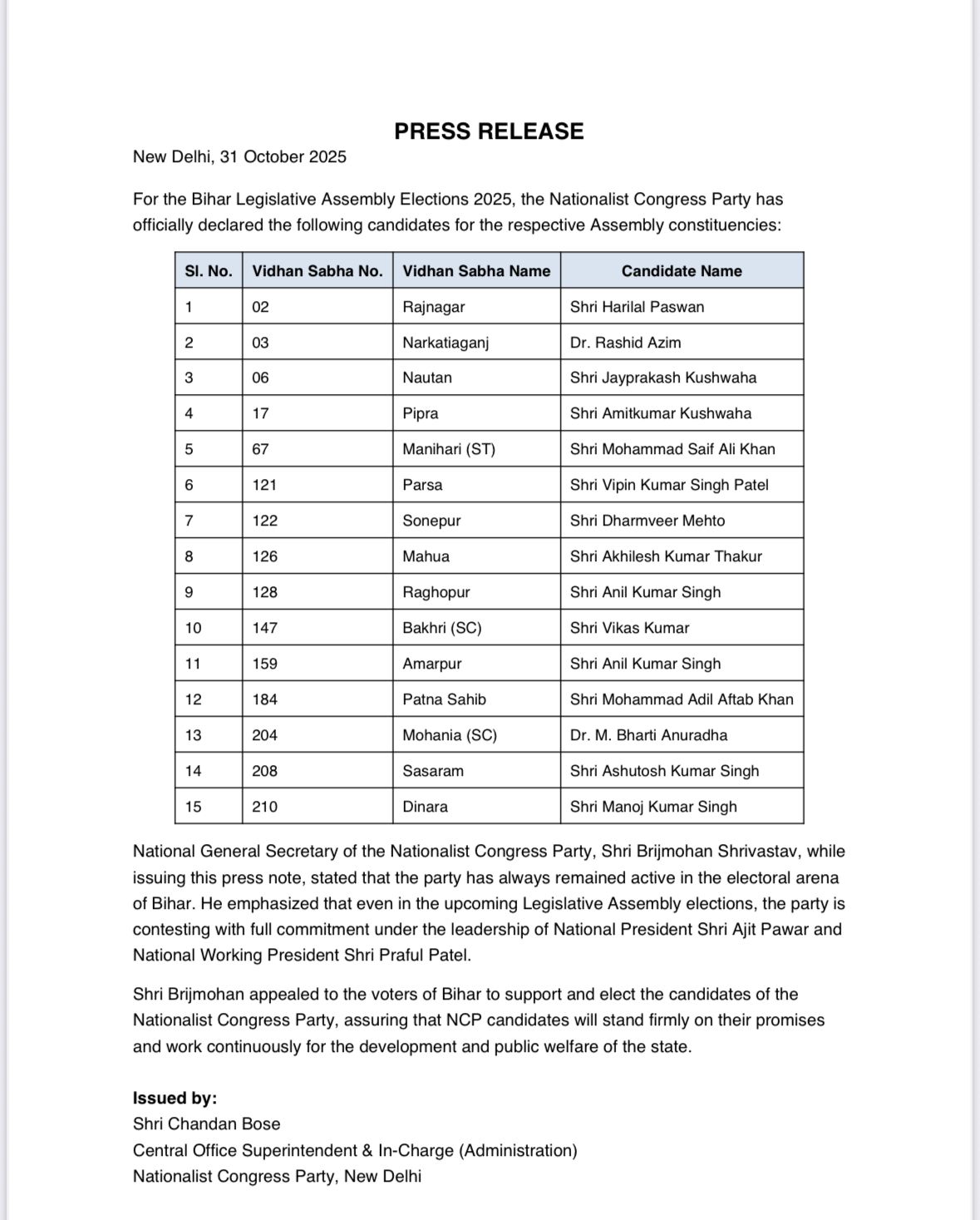 नई दिल्ली, 02 नवंबर: राष्ट्रवादी कांग्रेस पार्टी (NCP) ने आगामी बिहार विधानसभा चुनाव 2025 के लिए अपनी चुनावी सक्रियता दिखाते हुए 15 विधानसभा क्षेत्रों के लिए उम्मीदवारों के नामों की आधिकारिक घोषणा कर दी है। पार्टी के केंद्रीय कार्यालय (नई दिल्ली) से 31 अक्टूबर 2025 को जारी एक प्रेस रिलीज़ में इन प्रत्याशियों के नामों का ऐलान किया गया।