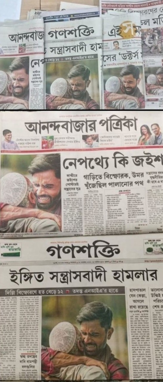 क्या यह सिर्फ़ एक संयोग है , या इसके पीछे कोई सोची-समझी साज़िश छिपी है ? अख़बार के आम पाठक को इसका जवाब शायद कभी न मिले , लेकिन “न्यूज़ बनाने वाले” लोगों को इसकी जड़ें अच्छी तरह पता हैं । कोलकाता से प्रकाशित दैनिक बंगला के पहले पेज की तस्वीर देखिए । यह अख़बार वामपंथी विचारधारा का प्रमुख मुखपत्र माना जाता है । वैसे ही बंगाल के हर वर्ग का अपना अख़बार है — कोई कांग्रेस समर्थक जो खुद को “बंगालियों का रक्षक” कहता है , तो कोई हल्का-सा राष्ट्रवाद और हिंदुत्व का स्वाद लिए “स्वदेशी” अख़बार भी है । पर दिलचस्प बात यह है कि इन सबके पहले पन्ने पर आज एक जैसी तस्वीर छपी है । ख़बर है — दिल्ली का बड़ा बम धमाका ।