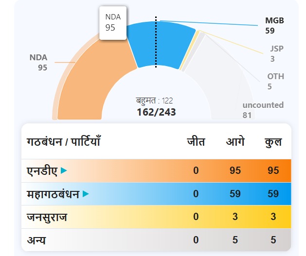 - शुरुआती रुझानों में राष्ट्रीय जनतांत्रिक गठबंधन (NDA) ने महागठबंधन (MGB) पर बढ़त बना ली है, लेकिन मुकाबला कांटे की टक्कर वाला बना हुआ है।