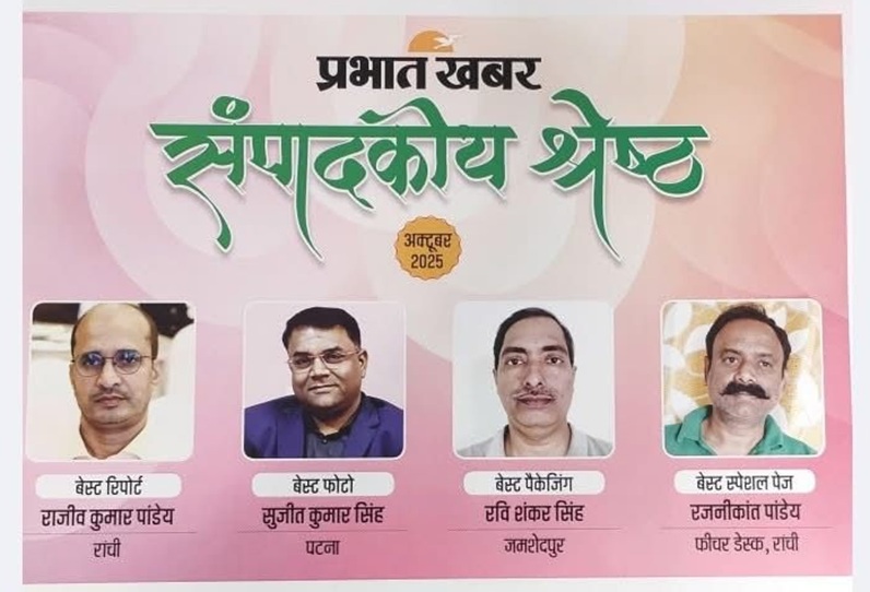 रांची, 13 दिसंबर: प्रभात खबर ने अक्टूबर 2025 के लिए अपने प्रतिष्ठित ‘संपादकीय श्रेष्ठ’ सम्मान के विजेताओं की घोषणा कर दी है। इस सम्मान के माध्यम से अखबार हर माह पत्रकारिता, फोटोग्राफी और संपादकीय प्रस्तुति में उत्कृष्ट कार्य करने वाली प्रतिभाओं को प्रोत्साहित करता है।