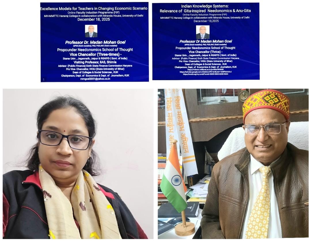 नई दिल्ली | 18 दिसंबर: नीडोनॉमिक्स विचारधारा के प्रवर्तक, तीन बार कुलपति रह चुके तथा कुरुक्षेत्र विश्वविद्यालय के सेवानिवृत्त प्रोफेसर प्रो. मदन मोहन गोयल ने फैकल्टी इंडक्शन प्रोग्राम (FIP) के दौरान दो व्याख्यान दिए “परिवर्तित आर्थिक परिदृश्य में शिक्षकों के लिए उत्कृष्टता के मॉडल” तथा“भारतीय ज्ञान प्रणाली: गीता-निर्देशित नीडोनॉमिक्स और अनु-गीता की प्रासंगिकता”।