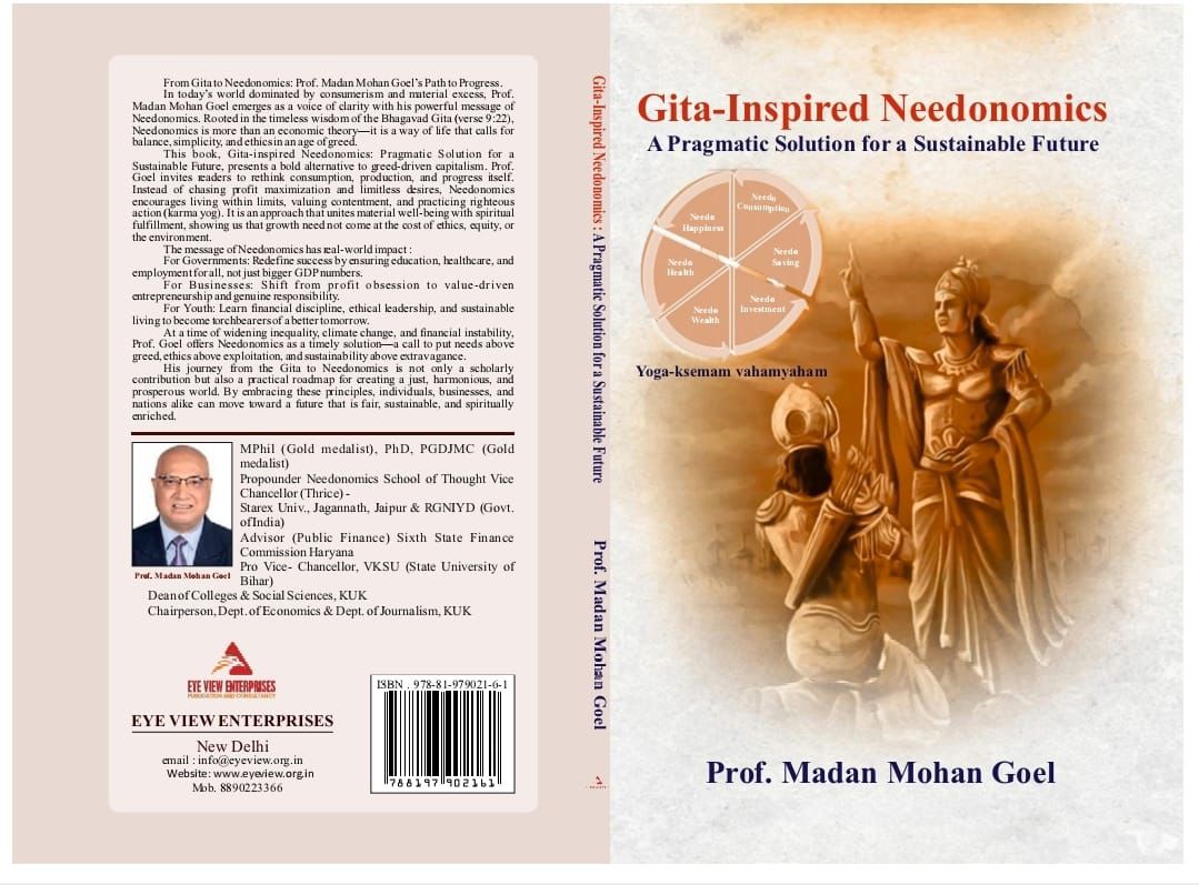 प्रो. मदन मोहन गोयल की नवीनतम पुस्तक “गीता-प्रेरित नीडोनॉमिक्स: एक सतत भविष्य के लिए व्यावहारिक समाधान” समकालीन आर्थिक विमर्श में एक महत्वपूर्ण और समयानुकूल योगदान है। जब वैश्विक अर्थव्यवस्था जलवायु संकट, बढ़ती असमानता, संसाधन क्षरण और उपभोक्तावाद की चरम प्रवृत्ति से जूझ रही है, तब यह पुस्तक एक ताज़ा और मूल्य-आधारित विकल्प प्रस्तुत करती है। नीडोनॉमिक्स स्कूल ऑफ थॉट (एनएसटी ) के प्रणेता के रूप में, प्रो. एम.एम गोयल भगवद् गीता के शाश्वत ज्ञान को आधुनिक आर्थिक यथार्थों के साथ जोड़ते हुए एक समग्र ढाँचा प्रस्तुत करते हैं। इसका परिणाम एक ऐसा बौद्धिक संगम है जो दार्शनिक भी है, व्यावहारिक भी, और दूरदर्शी भी।