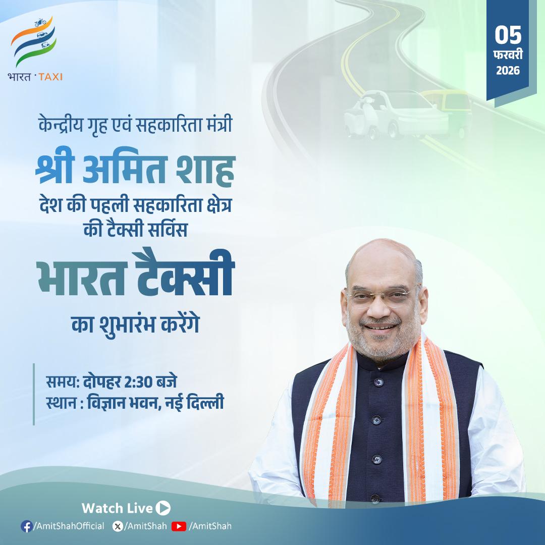 नई दिल्ली। 05 फरवरी: सरकार की सहकारिता-आधारित टैक्सी सेवा ‘भारत टैक्सी’ का आज औपचारिक शुभारंभ हो रहा है। लॉन्च से पहले केंद्रीय गृह एवं सहकारिता मंत्री अमित शाह ने कहा कि यह प्लेटफॉर्म टैक्सी चालकों के लिए कमाई बढ़ाने के साथ-साथ सम्मान और स्वामित्व भी सुनिश्चित करेगा।