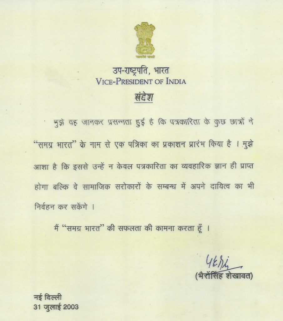 समग्र भारत.!!!एक नाम है विचार का ,समाचार का ,आन्दोलन का ,समग्रता का ,समग्रता में अनेकता का,वैश्विक भारत का और हमारी राष्ट्र भाषा राज भाषा हिंदी को विश्व पटल पर स्थापित करने का.सबको पता है कि हिंदी की आजीवन वकालत हमारे भारत के उपराष्ट्रपति श्री भैरों सिंह शेखावत ने की थी.उनके ही परिकल्पना के अनुसार और उनके आशीर्वाद से हमारी टीम ने समग्र भारत का प्रकाशन वर्ष २००३ में शुरू किया गया था.जो आज भी कई प्रकार के संघर्षों के वावजूद अनवरत जारी है.
