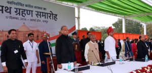 राज्यपाल से मुख्य सचिव श्री डीबी गुप्ता ने शपथ दिलाने के लिए आग्रह किया। इसके बाद राज्यपाल श्री सिंह ने श्री अशोक गहलोत को शपथ दिलाई। राज्यपाल ने श्री सचिन पायलट को भी पद एवं गोपनीयता की शपथ दिलाई। श्री गहलोत तीसरी बार राज्य के मुख्यमंत्री बने हैं।
