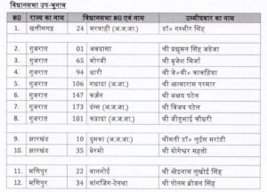 प्रधानमंत्री नरेंद्र मोदी की मौजूदगी और भाजपा अध्यक्ष जगत प्रकाश नड्डा की अध्यक्षता में कल रात हुई केंद्रीय चुनाव समिति की बैठक में यह निर्णय लिया गया। गुजरात की सात, मणिपुर की चार, झारखंड और ओडिशा की दो – दो तथा छत्तीसगढ़ की एक सीट के लिए उपचुनाव होना है। भाजपा के महासचिव अरुण सिंह ने आज यहां उम्मीदवारों की सूची घोषित की।