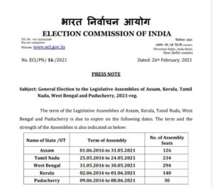पश्चिम बंगाल में आठ चरणों में चुनाव होंगे। वहीं असम में तीन और केरल, पुडुचेरी और तमिलनाडु में एक चरण में चुनाव होगा। असम में प्रथम चरण का मतदान- 27 मार्च, दूसरे चरण का मतदान- 1 अप्रैल और तीसरे चरण का मतदान -6 अप्रैल को होगा। केरल, तमिलनाडु और पुडुचेरी में 6 अप्रैल को मतदान होंगे। सभी राज्यों में मतगणना की 2 मई को होगी।