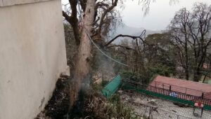 मसूरी में वन विभाग द्वारा पेड़ों को काटने वालों और नुकसान पहुंचाए जाने को लेकर कोई ठोस कार्रवाई नहीं की जा रही है जिसको लेकर वन माफियाओं के हौसले बुलंद हैं। मसूरी के झूलाघर हैक्मंस कंपाउंड के पास किसी असमाजिक तत्व द्वारा देर रात को एक बडे पेड की जड में आग लगा दी जिससे पेड़ रविन्द्र रौथाण के घर के ऊपर जा गिरा। गनीमत रही की पेड का बडा भाग पास के दूसरे पेड से ठकरा का लटक गया वह पेड के कुछ टहने घर की छत पर जा गिरे जिससे घर को आंशिक रूप से नुकसान पहुचा। रविन्द्र रौथाण ने बताया कि सुबह के समय घर के पास जोर से कुछ गिरने की आवाज आई तो उन्होने देखा की घर की छत पर पेड के बडे टहने टूट कर गिरे है वह टूटे हुए पेड का बडा भाग दूसरे पेड के के सहारे लटका हुआ है।