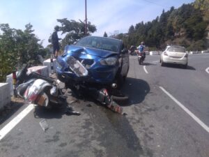 मसूरी कोतवाल देवेन्द्र असवाल ने बताया कि मसूरी देहरादून रोड पर एक डेटसन कार यूके07 बीयू 6105 ने गलत दिशा में आकर एक्सेस स्कूटी यूके07 टीवी 2996 में सवार हितार्थ पुत्र केतन शाह(23) निवासी एमजी रोड गुड़गांव दिल्ली और कंचन राय पुत्री माया देवी राय (26) निवासी गुड़गांव दिल्ली मसूरी घूमने के लिए आ रहे थे वही पल्सर मोटरसाइकिल यूके07 एएस व0412 में अभिषेक पुत्र उमेश चंद(24)निवासी कोटद्वार पौड़ी गढ़वाल व एकता पुत्री मनवीर सिंह पवार (24) निवासी प्रेमनगर देहरादून से मसूरी घूमने आ रहे थे। कार चालक द्वारा मसूरी ेम देहरादून तेज गति में आकर गलत दिशा में आकर टक्कर मार दी। वही गाड़ी छोड़कर चालक फरार हो गया था। उन्होने बताया कि पुलिस द्वारा कार चालक को हिरासत मंे ले लिया है व मामले की जांच की जा रही है। उन्होने बताया कि कार चालक ने बताया कि उसकी कार के ब्रेक फेल हो गए थे वह कारों को बचाने के चक्कर में वह गलत दिशा में जाकर टक्कर लग गई जिससे चपेट में कुछ वाहन में आये गए थे।