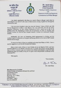 अमित मित्रा ने केंद्रीय पेट्रोलियम मंत्री को लिखे पत्र में लिखा है कि आरएमडी यूनिट बंद करने के फैसले से बंगाल के दुर्गापुर और बर्नपुर यूनिट को कच्चे माल (लौह अयस्क) की आपूर्ति का कोई स्रोत नहीं बचेगा। सेल आरएमडी (कोलकाता) के कर्मचारी कोरोना संकट के समय बेहद बुरे दौर से गुजर रहे हैं. इसे बंद करने का फैसला लिया गया तो बंगाल में स्थित दुर्गापुर और बर्नपुर इस्पात संयंत्रों का काम हद तक बाधित होगा. फैसले पर फिर विचार करना चाहिए।