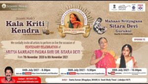 कार्यक्रम के संयोजक और कलाकार राजेश मिश्रा ने बताया कि हम नृत्य साम्राज्ञी पद्म श्री डॉ सितारा देवी जी का जन्म शताब्दी मना रहे हैं।फेसबुक पेज पर आप सब सादर आमंत्रित हैं अगले एपिसोड के कलाकार श्रीमती श्वेता सुमन (भागलपुर, बिहार) ,श्वाति मोदी तिवारी (जबलपुर, मध्यप्रदेश ) हैं। कार्यक्रम का प्रसारण 4 जुलाई ,8 जुलाई एवं 10 जुलाई को पद्मश्री स्वर्गीय सितारा देवी के पेज से होगा।