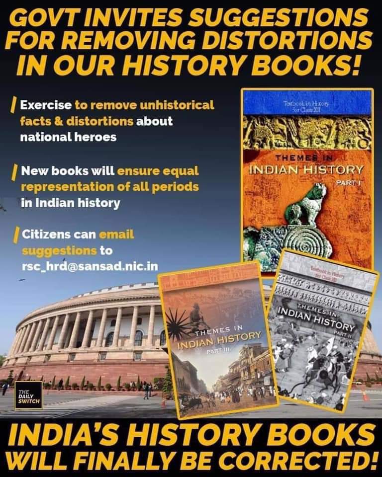 7. भारतीय इतिहास लिखने की अनुमति केवल विशुद्ध भारतीय इतिहासकारों को ही हो जो कि तथ्यों और प्रमाणों के आधार पर पाठ्य पुस्तकों के लिए इतिहास लिखें और JNU, DU के वामपंथी और देश विरोधी प्रोफ़ेसरों को भारतीय साहित्य और इतिहास लिखने की अनुमति न हो । और यदि कोई भी व्यक्ति किसी पाठ्यपुस्तक में कोई बात लिखे और वह अप्रमाणिक हो तो इसके लिए उसे 6 महीने का कारावास बिना बेल के हो ।