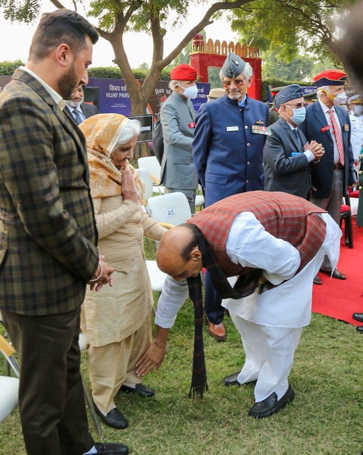 नई दिल्ली, 15दिसंबर। देश के सैनिकों को सम्मान बोलकर सम्मान तो हर कोई देता है लेकिन ऐसा बहुत कम होता है कि देश का कोई मंत्री उनके पैर छुकर उन्हें सम्मानित करें और वो भी भरी सभा में…लेकिन यह अद्भुत नजारा पहली बार देखने को मिला। जो दिल को छू लेने वाला था। जी हां रक्षा मंत्री राजनाथ सिंह ने मंगलवार को पाकिस्तान के साथ 1971 के युद्ध में अनुकरणीय साहस और लड़ाई की अदम्य भावना प्रदर्शित करने के लिए भारत के सर्वोच्च सैन्य सम्मान परमवीर चक्र से सम्मानित कर्नल होशियार सिंह की पत्नी धन्नो देवी के पैर छुए। देवी युद्ध का हिस्सा रहे भारतीय दिग्गजों, उनके परिवार के सदस्यों और बांग्लादेश के ‘मुक्ति योद्धाओं’ के उस समूह का हिस्सा थीं, जिनके साथ सिंह ने बातचीत की।