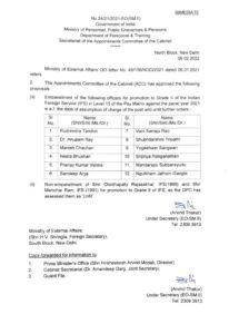 मंत्रालय की नियुक्ति समिति ने रुद्रेंद्र टंडन, डॉ अनुपम रे, मनीष चौहान, नीता भूषण, प्रणय कुमार वर्मा, संदीप आर्य, वाणी सरराजू राव, शुभदर्शिनी त्रिपाठी, योगेश्वर सांगवान, श्रीप्रिया रंगनाथन, मंदरापु सुब्बारायुडु, और नगुलखम जाथोम गंगटे को पदोन्नति के लिए चुना है। इससे पहले ये सभी अधिकारी विदेश मंत्रालय में विभिन्न पदों सेवा दे चुके हैं।
