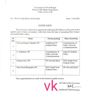 कोलकाता पुलिस के अतिरिक्त आयुक्त प्रवीण कुमार त्रिपाठी को हावड़ा का पुलिस आयुक्त तथा कोलकाता पुलिस ,दक्षिण पश्चिम की डीसीपी स्वाति भंगालिया हावड़ा , ग्रामीण की पुलिस अधीक्षक नियुक्त की गई हैं।