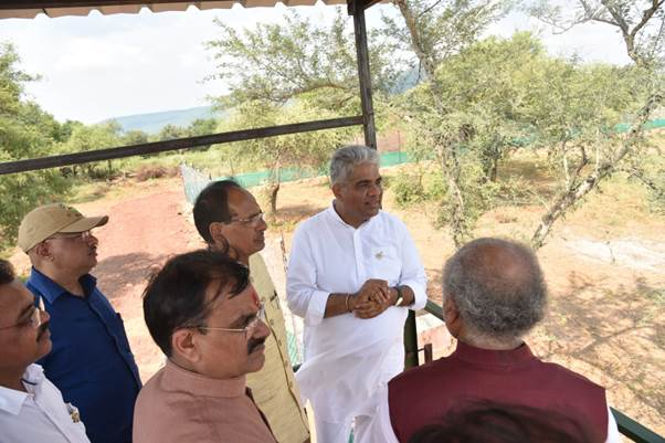 केंद्रीय पर्यावरण, वन और जलवायु परिवर्तन मंत्री के साथ केंद्रीय कृषि और किसान कल्याण मंत्री श्री नरेंद्र सिंह तोमर और मध्य प्रदेश के मुख्यमंत्री श्री शिवराज सिंह चौहान ने भी कूनो नेशनल पार्क में तैयारियों का जायजा लिया। इस अवसर पर श्री सी पी गोयल, महानिदेशक वन एवं स्पेशल सेक्रेटरी, डॉक्टर एसपी यादव, अपर महानिदेशक, एनटीसीए और वरिष्ठ अधिकारी भी उपस्थित थे।