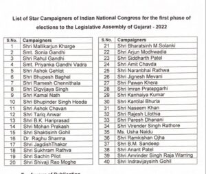 गुजरात चुनाव के पहले चरण का मतदान 1 दिसंबर को होना है. इसके लिए ही कांग्रेस ने 40 स्टार प्रचारकों की सूची जारी की है. सूची में पहले नंबर पर कांग्रेस अध्यक्ष मल्लिकार्जुन खड़गे , फिर सोनिया गांधी, राहुल गांधी और प्रियंका गांधी के नाम शामिल हैं.