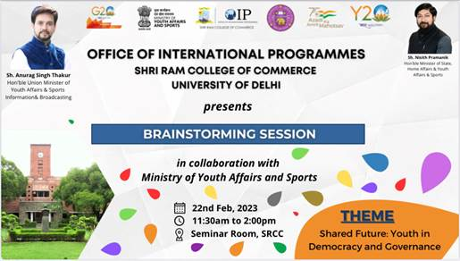 नई दिल्ली ,21 फरवरी।लोकतंत्र और शासन के क्षेत्रों में युवाओं की शक्ति को रेखांकित करने के प्रयास के तहत अंतर्राष्ट्रीय कार्यक्रम कार्यालय, श्री राम कॉलेज ऑफ कॉमर्स (ओआईपी-एसआरसीसी) युवा कार्यक्रम और खेल मंत्रालय, भारत सरकार के सहयोग से 22 फरवरी 2023 को एक विचार-मंथन कार्यशाला का आयोजन कर रहा है। यह विचार-मंथन कार्यशाला जी-20 के समग्र ढांचे के तहत यूथ-20 कार्य समूह की गतिविधियों का अंग है।